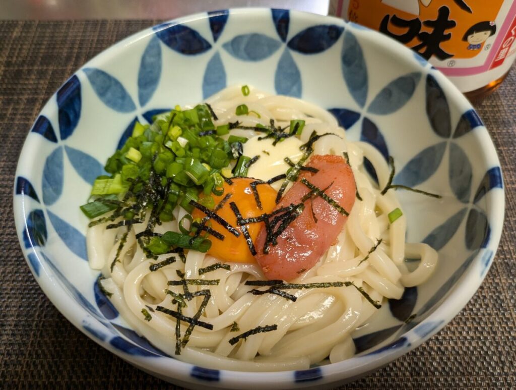 かくし味をかけてグルグルグルグルまぜて食べるだけのめんたい釜玉うどん☺️