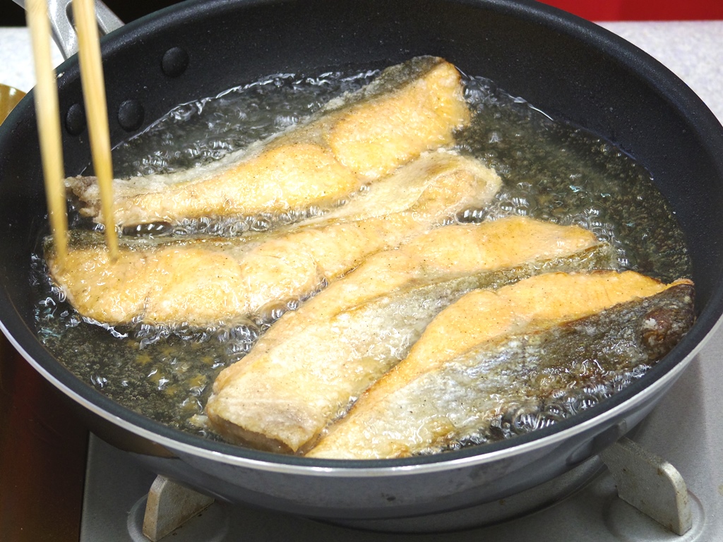 フライパンに揚げ油を熱して、鮭を揚げます。