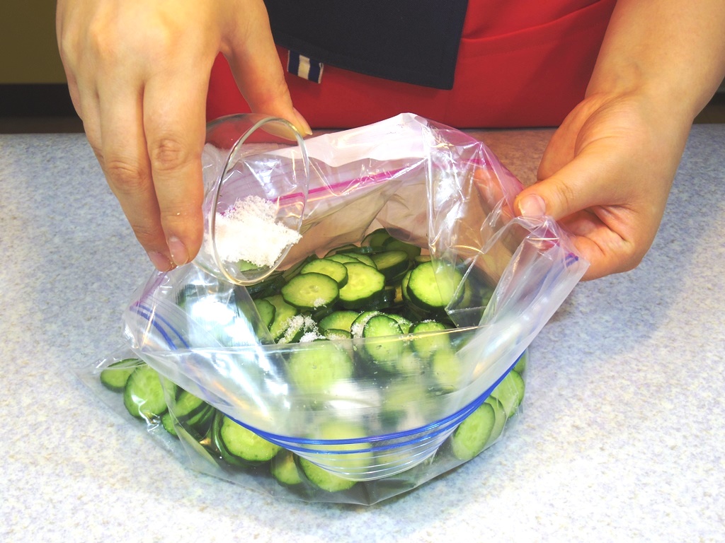 塩漬けしたきゅうりはしっかりと水を切りましょう。しっかり水切りすると、出来た時のシャキシャキ感がアップします。