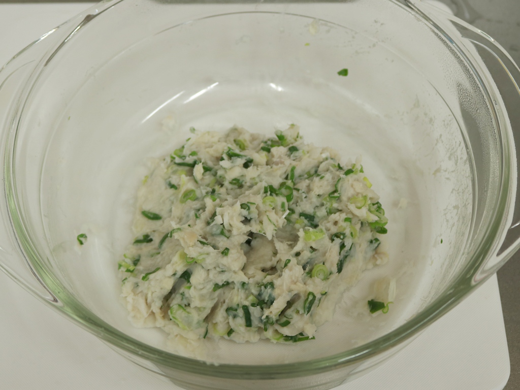 里芋水煮の水分を切り、耐熱容器に入れラップをかけ、2分くらいレンジで温めたら里芋が熱いうちにつぶし、バターと青ネギを入れて混ぜ合わせます。