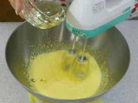 Aを混ぜ、サラダ油を少しずつ加え、つやが出るまで混ぜ、次にBを入れ、全体が白っぽくもったりするまでよく混ぜます。 (オーブンを160℃で予熱)